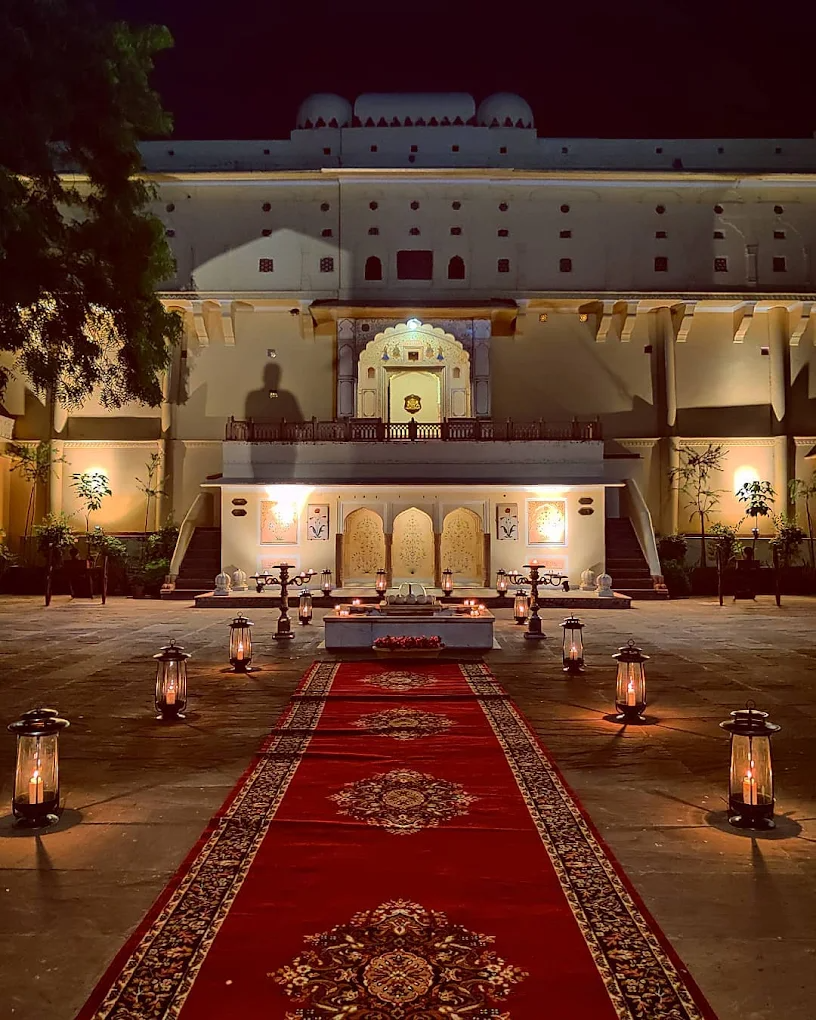 For destination weddings, the ideal place in Jaipur to get married is Mundota Fort & Palace. There are as many as 12 varied banqueting spaces at this property, some lush gardens, beautifully crafted indoor halls, terraces, and pavilions, each of which is a testament to the architectural brilliance of the Rajput-Mughal era, thus giving your pre-wedding ceremonies, sangeet, reception, etc. a magnificent backdrop.