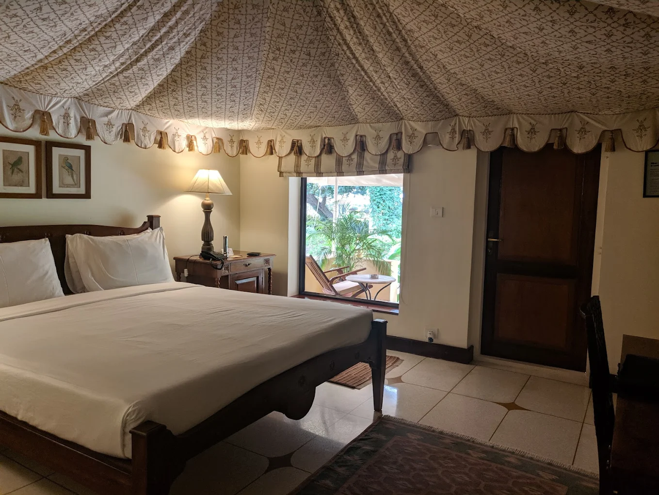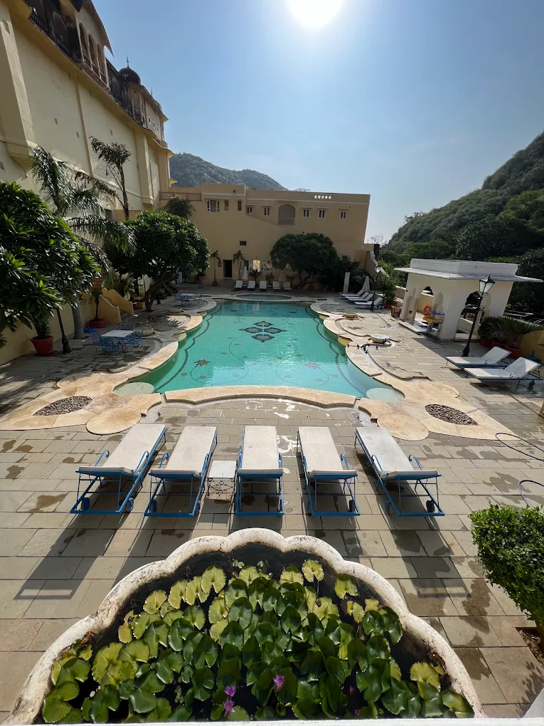 The Samode Palace offers 43 heritage suites, a treat better than any you could ever imagine! The Royal Suite on the top floor is our favourite decorated in classic hues of red, gold, and ivory with glistening marble floors and warm wooden furniture.